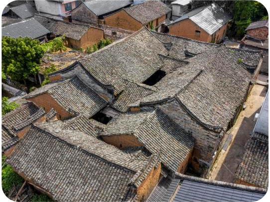 江东村现存传统民居33座,其多为清代中早期建筑,传承了徽派元素的桂北民居。聚落民居整体坐北朝南,外墙或以青砖砌筑,或以黄土夯筑,为歇山式屋顶、抬梁式结构建筑。内部以梁柱支撑,栅以木壁。有的底部有用条石为壁基,天井以石板砌成。村内集中连片的古民居,各种建筑材料及结构的古民居保存基本完好。
