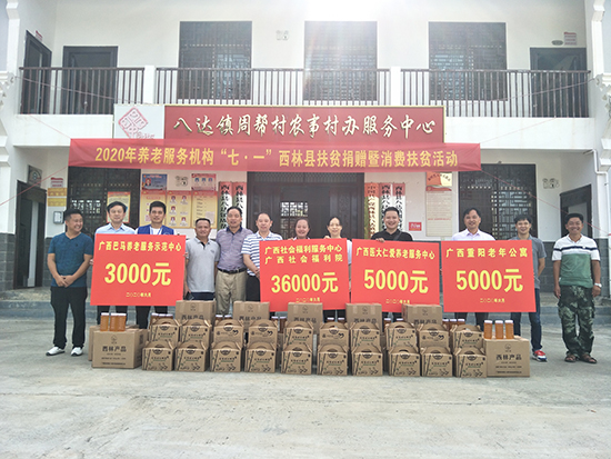 6月22日至24日,广西社会福利服务中心(广西社会福利院)、广西巴马养老服务示范中心、广西医大仁爱养老服务中心、广西重阳老年公寓等我区部分养老服务机构共同到百色市西林县开展扶贫捐赠、消费扶贫暨“一帮一联”结对帮扶主题党日活动。 参与活动的养老服务机构除向西林县捐赠扶贫资金4.9万元外,还积极对接贫困村参与消费扶贫工作,以实际行动助力西林县打赢脱贫攻坚战。